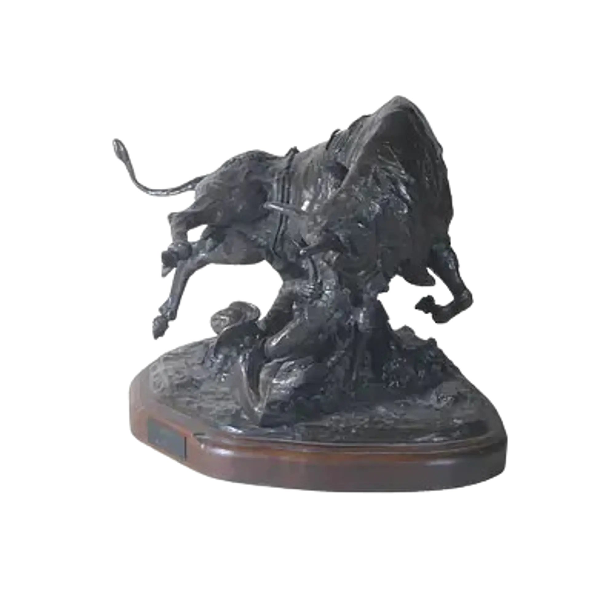 A standout in Ed’s Black Frontier Spirit series, Dusted captures a thrilling, high-impact moment in rodeo history. This intricate sculpture pays tribute to Bill Pickett, a pioneering Black cowboy and rodeo legend who invented the technique of "bulldogging"—taming steers with strength, skill, and fearlessness. Pickett became a star in early 20th-century Wild West shows, defying racial barriers and cementing his place in cowboy lore. With this epic bronze, Ed shows him dismounting a bucking bull mid-air, the raw energy and precision of the moment preserved in bronze.