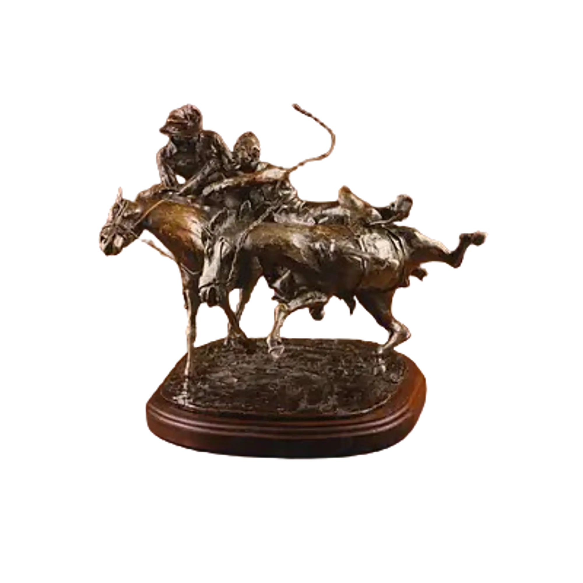 Commissioned by the State of Colorado in 1976 as part of Ed’s groundbreaking Black Frontier Spirit series, Eight is Enough is a thrilling tribute to the overlooked Black cowboys who shaped the early rodeo tradition. Often tasked with taming the wildest horses because they were seen as expendable, these riders became some of the most daring and skilled competitors in rodeo history. This dynamic sculpture captures that courage in full motion featuring one horse with all four hooves airborne, the rider dismounting in a perfect eight-second ride. The energy, tension, and craftsmanship in this bronze are nothing short of masterful.