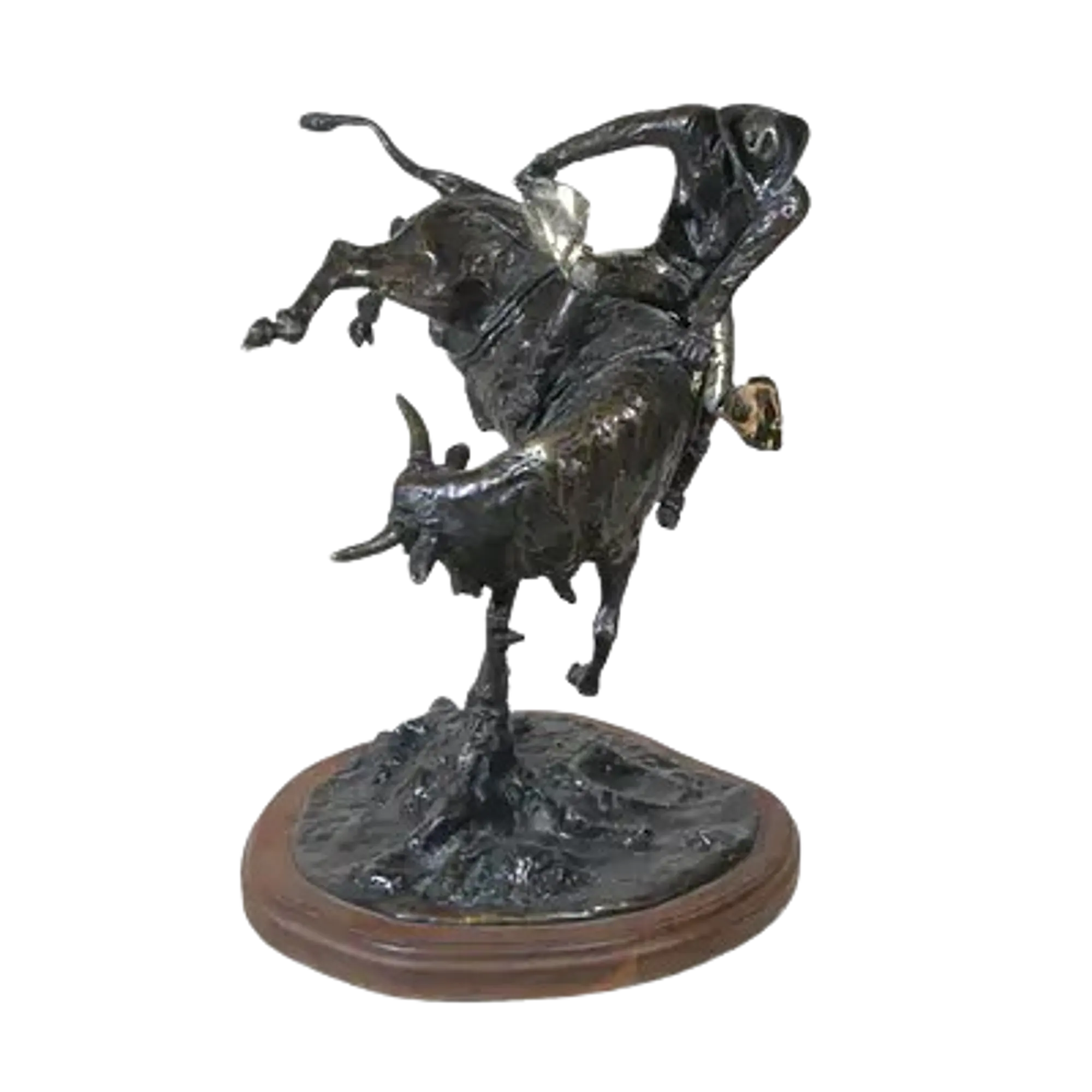 A dramatic showpiece from Ed’s acclaimed Black Frontier Spirit series, Every Which Way But Loose pays tribute to the raw courage and resilience of Black cowboys on the American frontier. Inspired by champion bull rider Charlie Sampson, this breathtaking sculpture captures the high-stakes moment of a rider clashing with a powerful, airborne bull. Ed’s mastery is on full display—not only in the explosive energy and realism of the scene but in the engineering feat of balancing this large bronze on a single bull’s leg. This work stands as one of Ed’s most dynamic and awe-inspiring Western pieces.