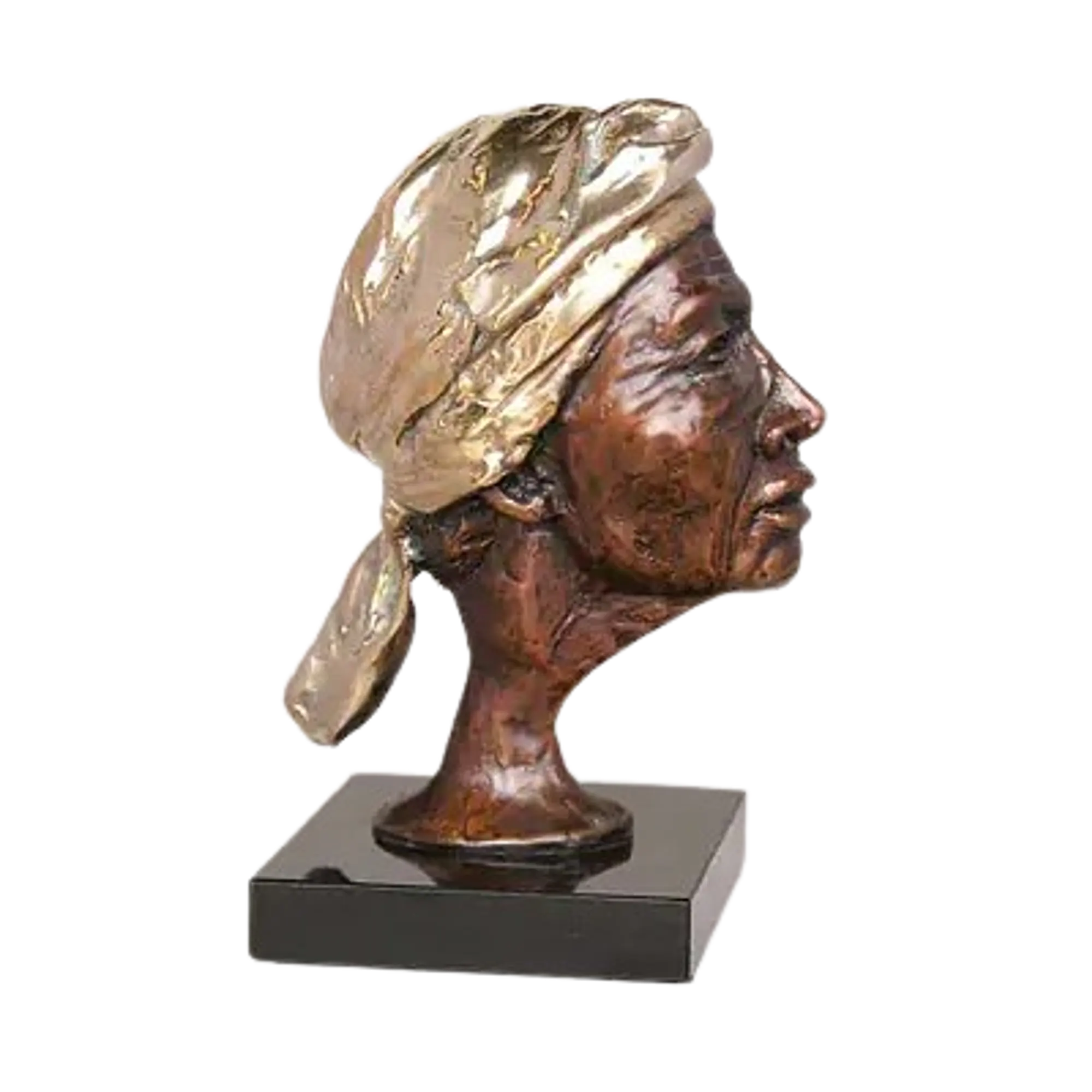 Pioneer Woman is a compelling introduction to Ed’s Black Frontier Spirit series. This intimate bronze sculpture portrays the determined profile of an early Black woman settler, her gaze lifted with quiet strength and resilience. Though modest in size, the work carries deep historical weight—honoring the generations of African Americans who journeyed West in search of freedom and opportunity. Her presence speaks not only to survival, but to the enduring spirit that helped shape the American frontier.