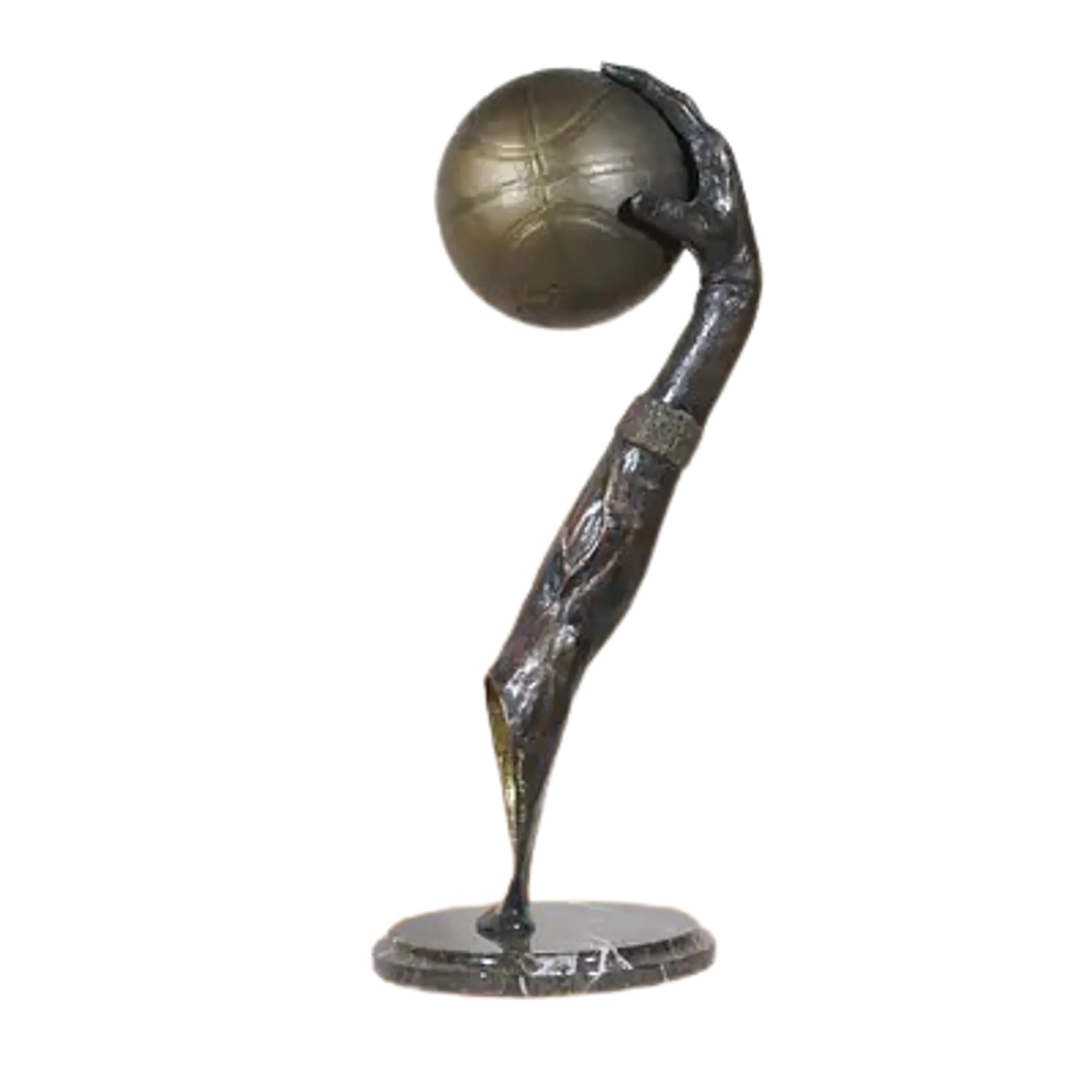 “Slam Dunk” captures the explosive energy and triumphant spirit of basketball in motion. Towering at 45 inches, this dynamic bronze sculpture features a powerful arm soaring upward, clutching a full-size ball just moments before delivering the dunk. It’s a celebration of athleticism, determination, and the awe-inspiring height of human achievement. With striking detail and Ed’s signature style, this piece is a true centerpiece for any space.