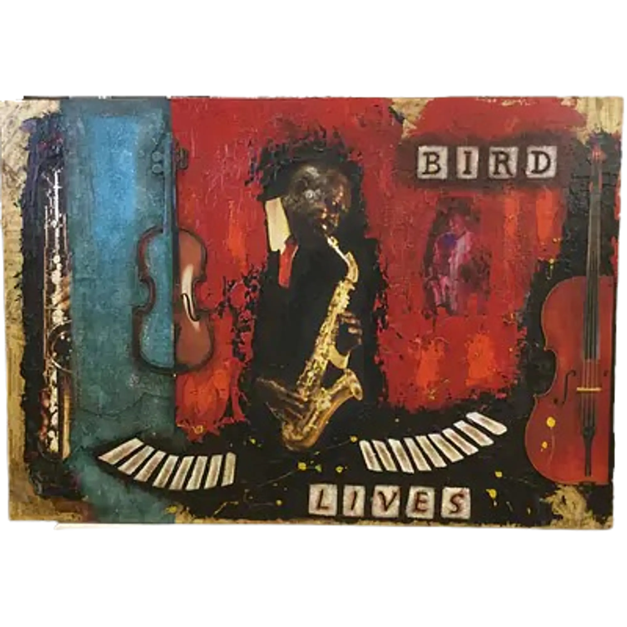 Bird Lives is a bold, mixed-media tribute to jazz icon Charlie Parker, known as “Bird.” At its heart is Ed’s signature negative space sculpture of Parker, where absence becomes presence and imagination brings the music to life. Surrounded by vibrant textures, instruments, and rich colors, this dynamic oil painting bridges sculpture and canvas in a celebration of sound, soul, and legacy.