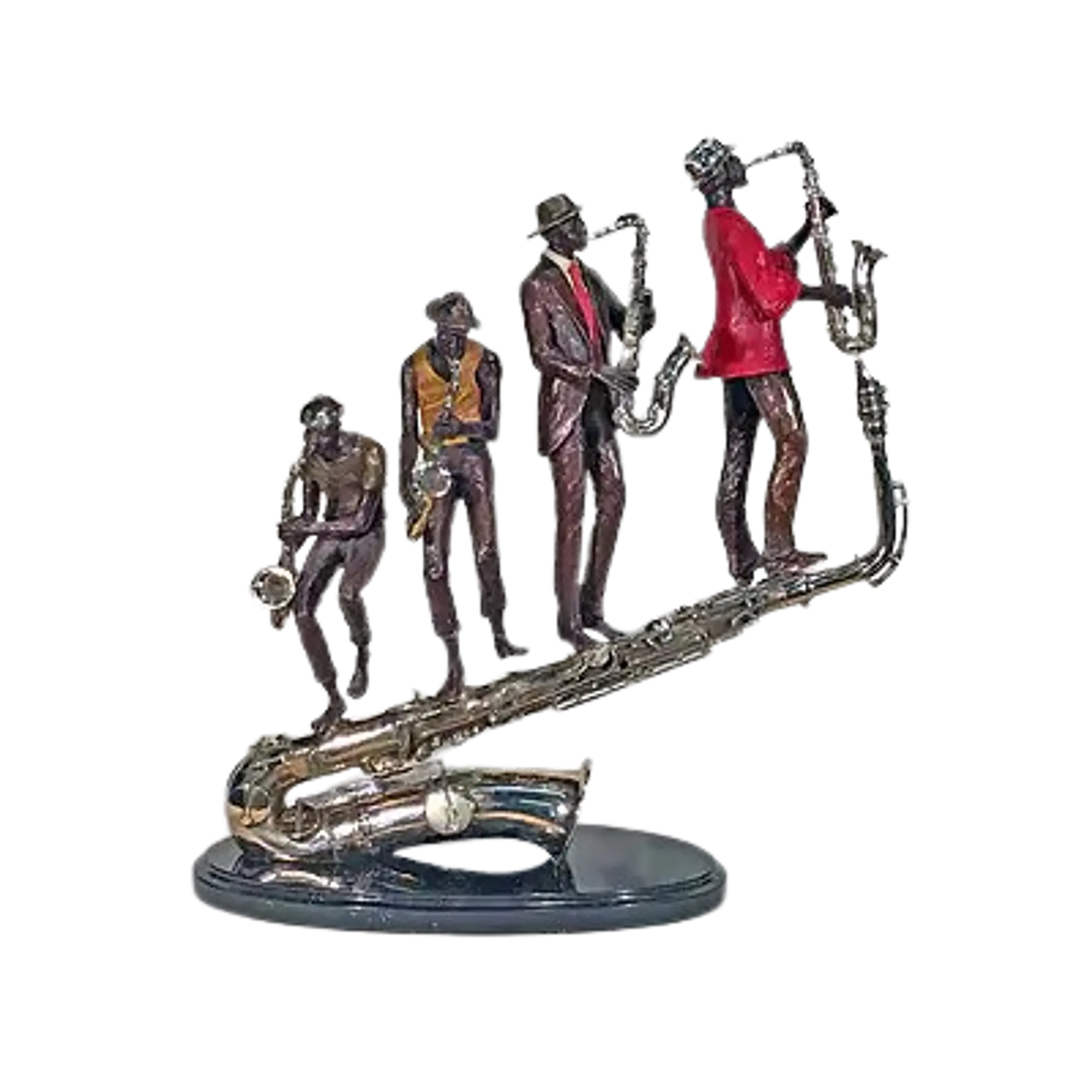 Bursting with rhythm, color, and motion, Everything You Wanted To Know About Sax is one of Ed’s most electrifying and sought-after works—so much so, it’s owned by a former U.S. President. This bold sculpture traces the soulful evolution of the saxophonist, from the raw sounds of early blues to the cool swagger of 1950s–60s jazz greats. Each of the four players dons period-specific attire, standing atop a gleaming oversized saxophone that unites them in sound and spirit. A celebration of music, history, and style, this piece radiates confidence, culture, and charisma.