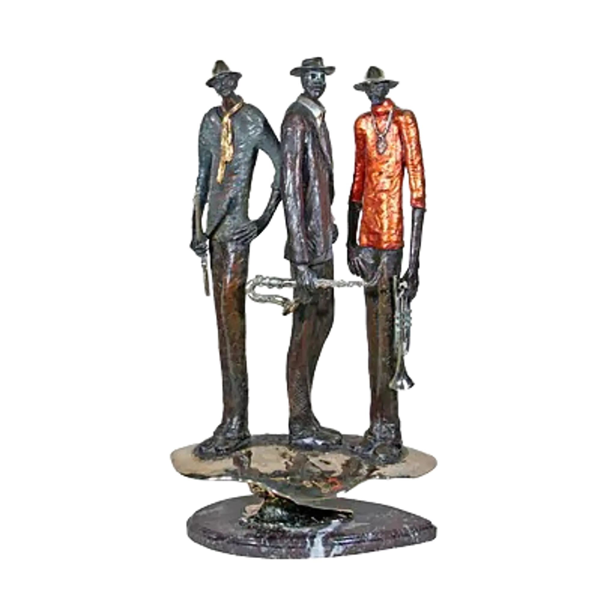 Ed’s Strictly Jazz is an electrifying tribute to the swagger and soul of America’s greatest musical export. With three stylized jazzmen—each with their own groove, flair, and signature patina—this sculpture pulses with movement, sound, and unmistakable cool. The polished curves, textured finishes, and bold presence showcase Ed’s extraordinary ability to sculpt rhythm into bronze.